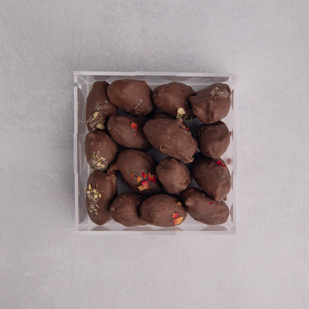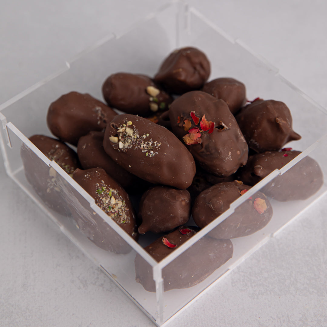 ٥٠٠ غرام من التمر المغطى بالشوكولاتة مع علبة ماي ديزاينز الخاصة