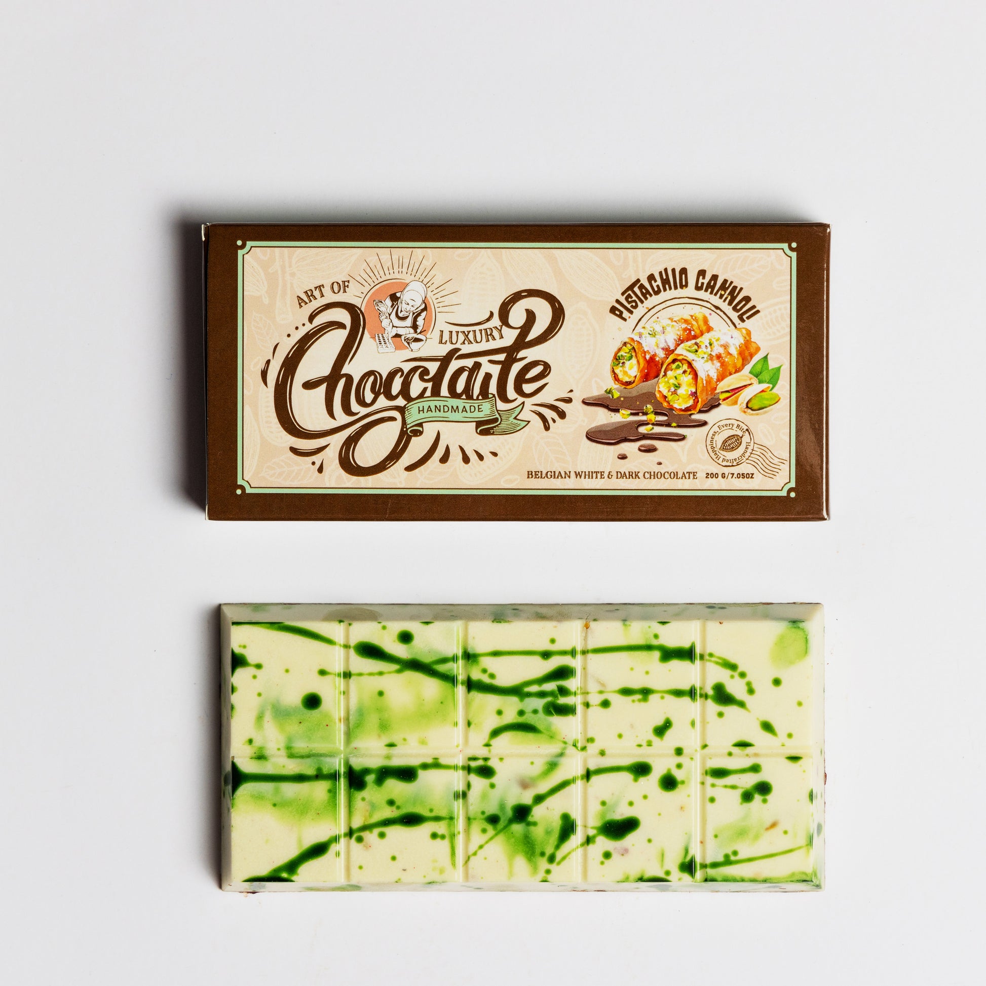 مزيج لذيذ من الشوكولاتة البيضاء الناعمة في الأعلى، والشوكولاتة الداكنة الغنية في الأسفل، وحشوة كانولي الفستق الأخضر النابضة بالحياة.