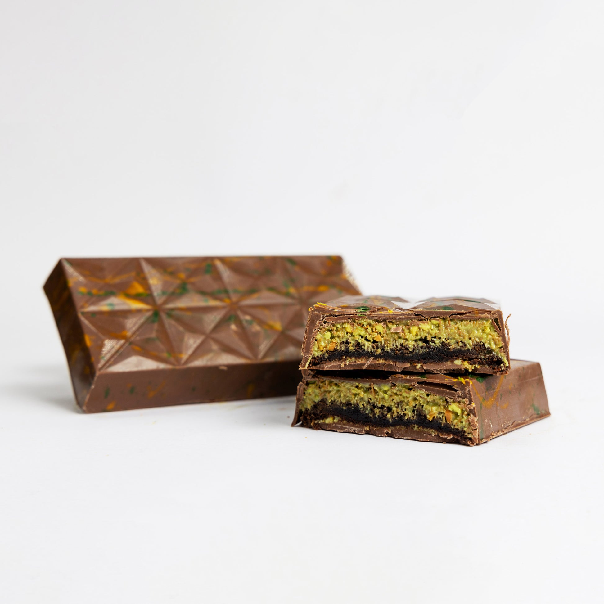 بار براوني الكنافة بالفستق - هذه قشرة شوكولاتة بالحليب رائعة محشوة بطبقة غير عادية من الكنافة المقرمشة الممزوجة بعجينة الفستق الغنية، وكل ذلك فوق قاعدة براوني طرية. إنه المزيج المثالي من النكهات الكريمية والمقرمشة والفاخرة. إذا كان يجعلك تبكي من السعادة، فأنت بالتأكيد لست وحدك!